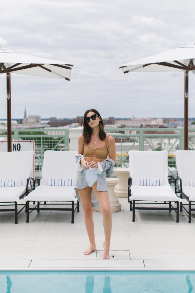 My favorite thing about the Bennett is hands down the rooftop. There’s a big, rooftop bar that feels very nautical meets Ralph Lauren. Cozy, yet light and airy. Just outside the large french doors, there’s a beautiful rooftop pool surrounded by cabanas and lounge chairs. We had the best day relaxing by the pool with beautiful views of downtown Charleston right in front of us!