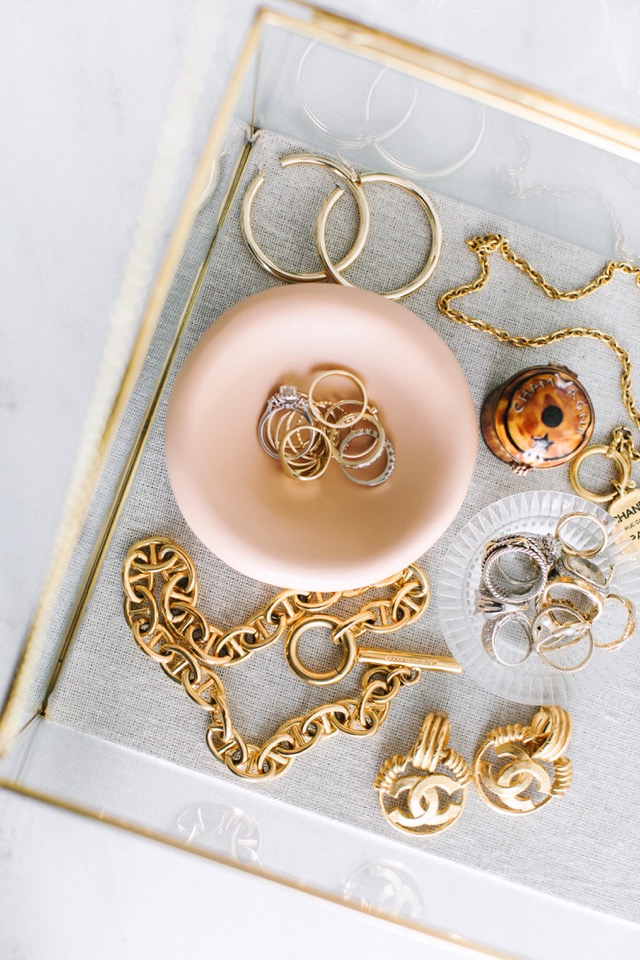 P.S. – THIS is the best jewelry box I’ve ever owned! It’s brass + glass with a linen base and it keeps all of my pieces so protected. It’s beautiful – I’ve had mine for about 3 years and it still looks great! My lalique dish that holds my rings, my limoge box that holds my stud earrings, and my French tray are all from my best friend, Paula and similar options can be found in her shop, if you’re interested!